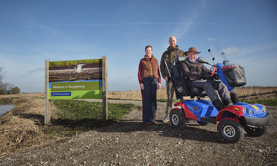 Wie vanuit Noorden richting Nieuwkoop rijdt, ziet het landschap langzaam veranderen. Waar vroeger vooral weilanden lagen, strekt zich nu het natuurgebied Ruygeborg uit, dat bestaat uit rietvelden, open water en graslanden met verschillende hoogtes. Die nieuwe natuur trekt steeds meer vogels én bezoekers. Voor de ontwikkeling van het natuurgebied werd vooraf advies ingewonnen bij het Kenniscentrum Groen & Handicap. “Het is belangrijk dat iedereen de natuur kan beleven,” zegt boswachter Juriaan van Leeuwen. Dat draagt bij aan een positieve kijk op natuurherstel.”