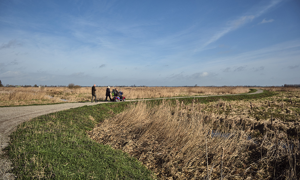Bezoekers van het natuurgebied en omwonenden uit de dorpen Noorden en Nieuwkoop kunnen na het broedseizoen zelfs helemaal doorwandelen tot aan natuurgebied de Groene Jonker. Voor Jessica Wagenaar uit Noorden ligt het natuurgebied bijna letterlijk voor de deur. Ze woont hier sinds 2006 en trekt graag de natuur in. Dat is voor haar niet altijd vanzelfsprekend, omdat haar oudste zoon Tim (12 jaar) in een rolstoel zit. “Met Tim de natuur in gaan is vaak een hele onderneming en kan lang niet overal.”